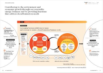 The first half of the report, titled “Value Creation Story”, aims to convey the flow that connects to the value creation process by summarizing the Company’s achievements and strengths to its future growth strategy. Additionally, the “Mid/Long-Term Growth Strategy”, which features “Trends in the Electric Power Industry” which the Company belongs to, the businesses the Company is strategically working on within the industry (aggregation business, carbon credits, etc.), and the overall picture, explains what is currently happening in the electric power industry and what the Company is aiming for.