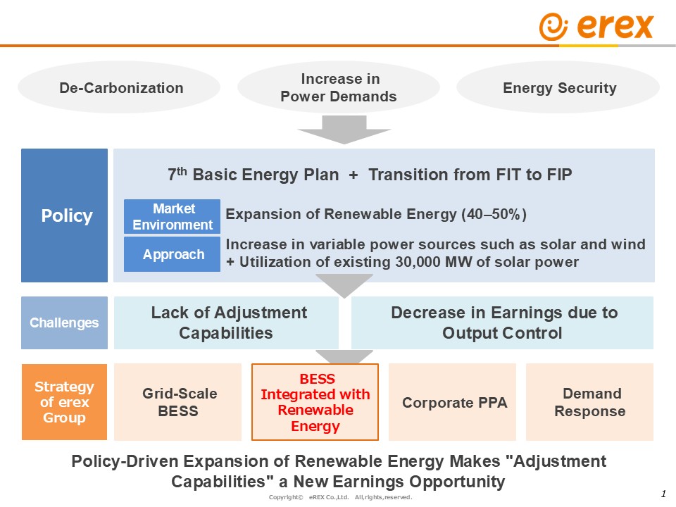 erex Co., Ltd. (Headquarters: Chuo-Ward, Tokyo, Representative Director & President: Hitoshi Honna; hereinafter referred to as “the Company”) positions its aggregation business, which combines diverse distributed power resources and provides them as supply/demand adjustment capabilities and market value, as a growth area, as announced in its mid-term business plan published on February 26, 2026. The Company is expanding this business by combining grid-scale BESS, BESS integrated with renewable energy, corporate PPA, demand response, etc. In this release, the Company outlines the role and growth opportunities of BESS integrated with renewable energy in particular.