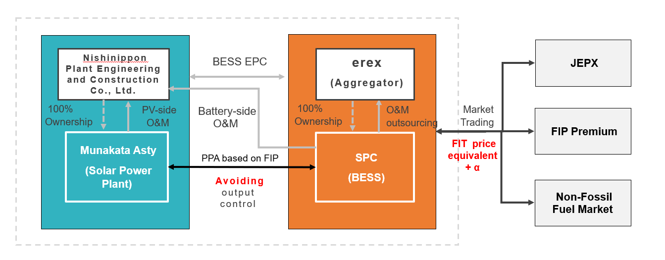 In the Project, the Company will install BESS at the solar power plant (hereinafter referred to as “the Power Plant”) owned by Munakata Asty Solar Power Co., Ltd. (Headquarters: Fukuoka City, Fukuoka Prefecture; Representative Director & President: Toshiyuki Kamakura), a wholly-owned subsidiary of Nishinippon Plant Engineering and Construction Co., Ltd. (Headquarters: Fukuoka City, Fukuoka Prefecture; Representative Director & President: Naoyuki Toyoshima). The Company will purchase electric power from the Power Plant and seek to generate earnings through market transactions. Through this initiative, the Company will contribute to grid stabilization, widespread adoption of renewable energy, and realization of de-carbonized society.