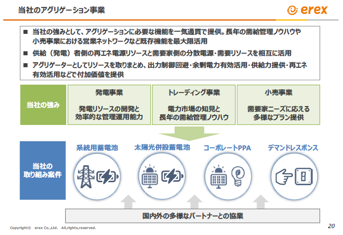 アグリゲーション事業には、電力小売、再エネ電源の開発・運営、発電・需要予測・制御の機能が必要ですが、当社はすでに既存事業においてこれらのノウハウを所有しております。2025 年6月9日に公表した「当社アグリゲート事業の戦略について」にてお示ししたとおり、現在、当社は、系統用蓄電池や再生可能エネルギーの電源開発、自社所有の再エネ活用支援等を通じて、アグリゲーション事業の拡大を進めております。